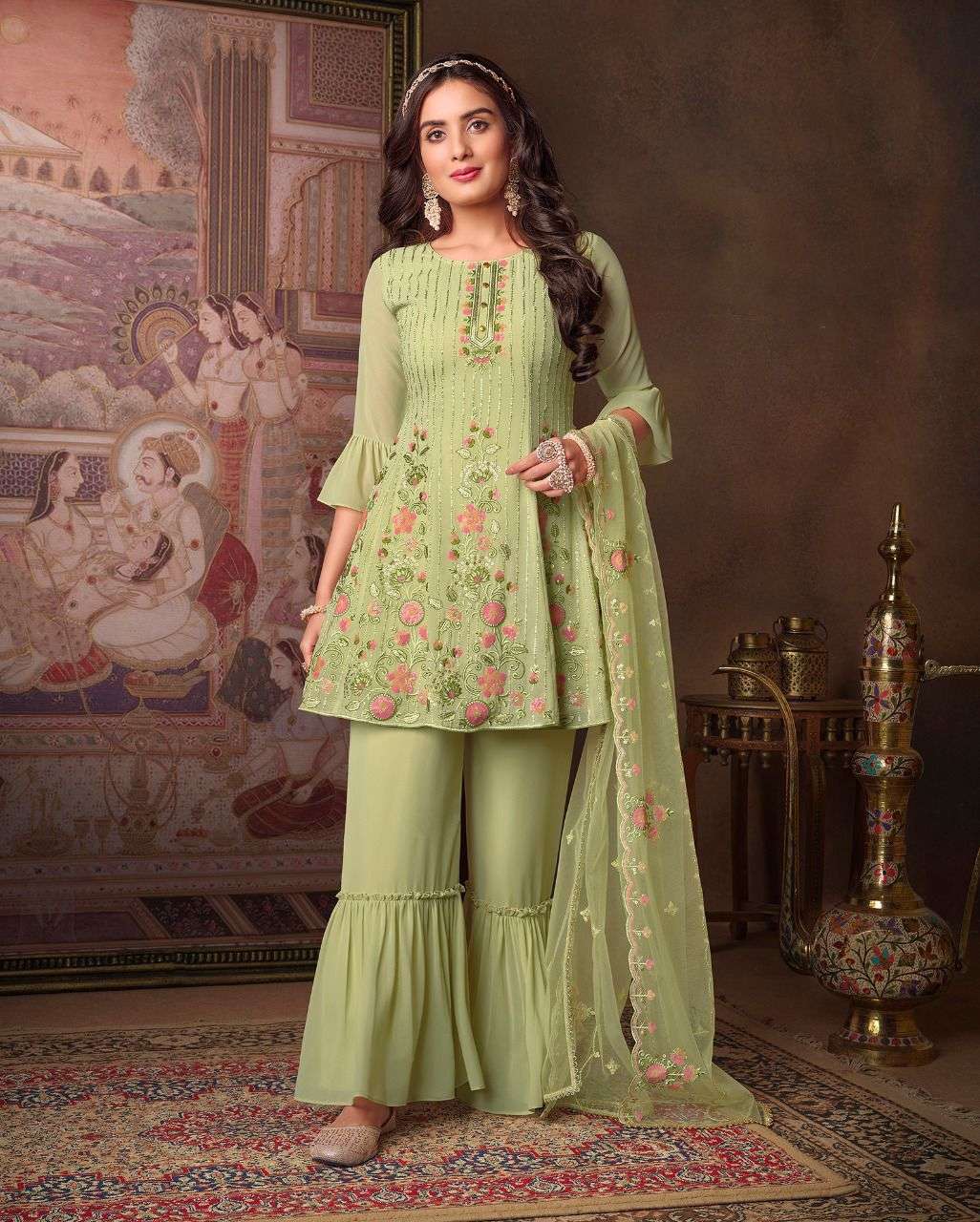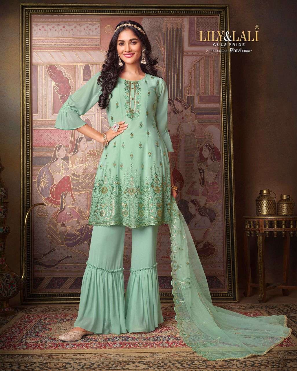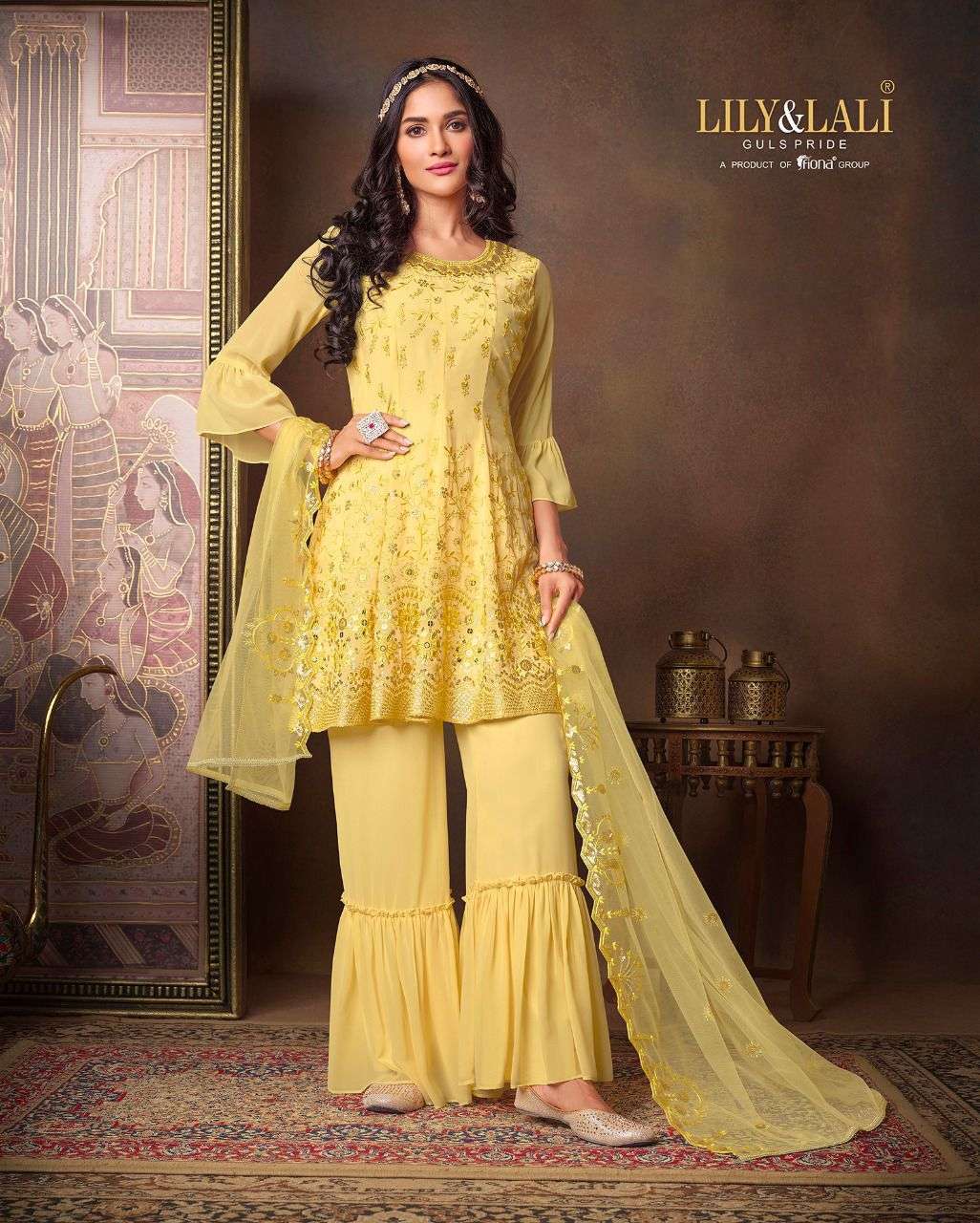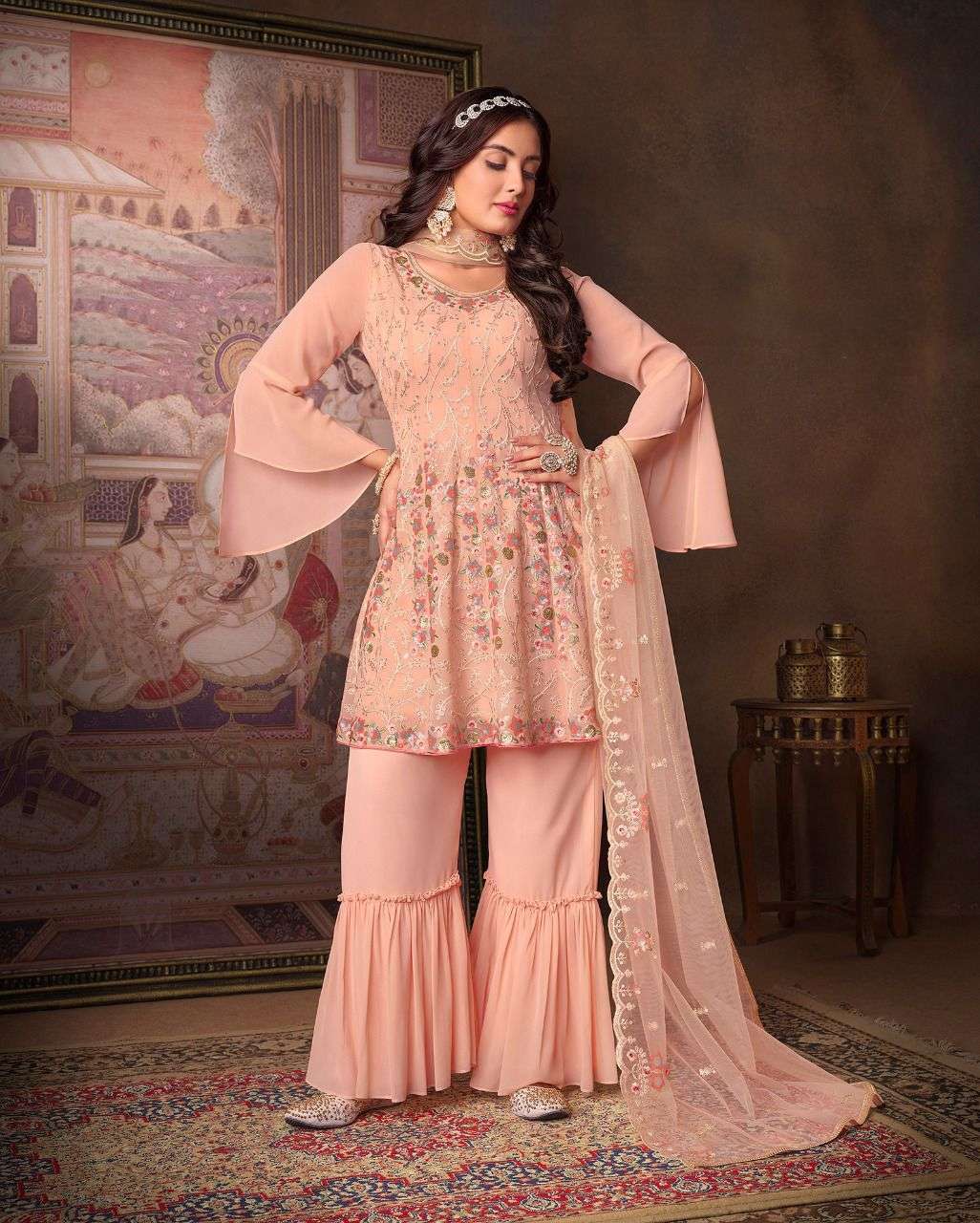 ARIZONA BY LILY & LALI BRAND SEQUENCE WORK ON HEAVY GEORGETTE SHORT KURTI WITH INNER AND GEORGETTE SHARARA WITH CUTWORK SEQUENCE EMBROIDERY ON HEAVY NET DUPATTA WHOLESALER AND DEALER