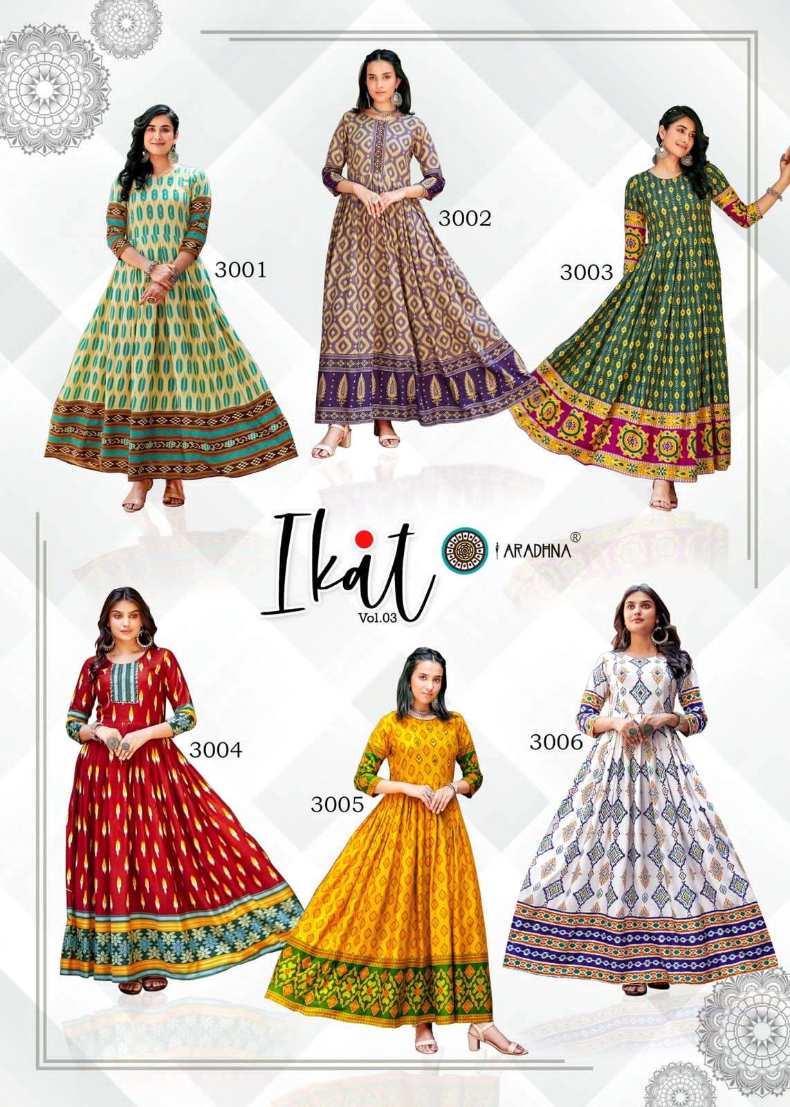 Buy Online IKAT VOL 3 LIVA TAG 14KG RAYON IKAT PRINT WITH WORK LONG GOWN BY ARADHNA BRAND WHOLESALER AND DEALER 12 Pcs of Full Catalogue at Wholesale Price. Looking for IKAT VOL 3 LIVA TAG 14KG RAYON IKAT PRINT WITH WORK LONG GOWN BY ARADHNA BRAND WHOLESALER AND DEALER Full Catalouge at Best Price? Buy Now IKAT VOL 3 LIVA TAG 14KG RAYON IKAT PRINT WITH WORK LONG GOWN BY ARADHNA BRAND WHOLESALER AND DEALER at Wholesale Rate of Rs 5760 with Total 12 Pcs from authroized dealer and supplier of ARADHNA Brand. Cost of Each piece is just only Rs 480 which is very low and affordable price to resale the product in your retail store S3Forever is Surat based Wholesale Supplier & Dealer of ARADHNA Brand. Click on Brand name to Know more about ARADHNA Brand's products.Call or Whatsapp on +91-7778818080 for booking or enquiry