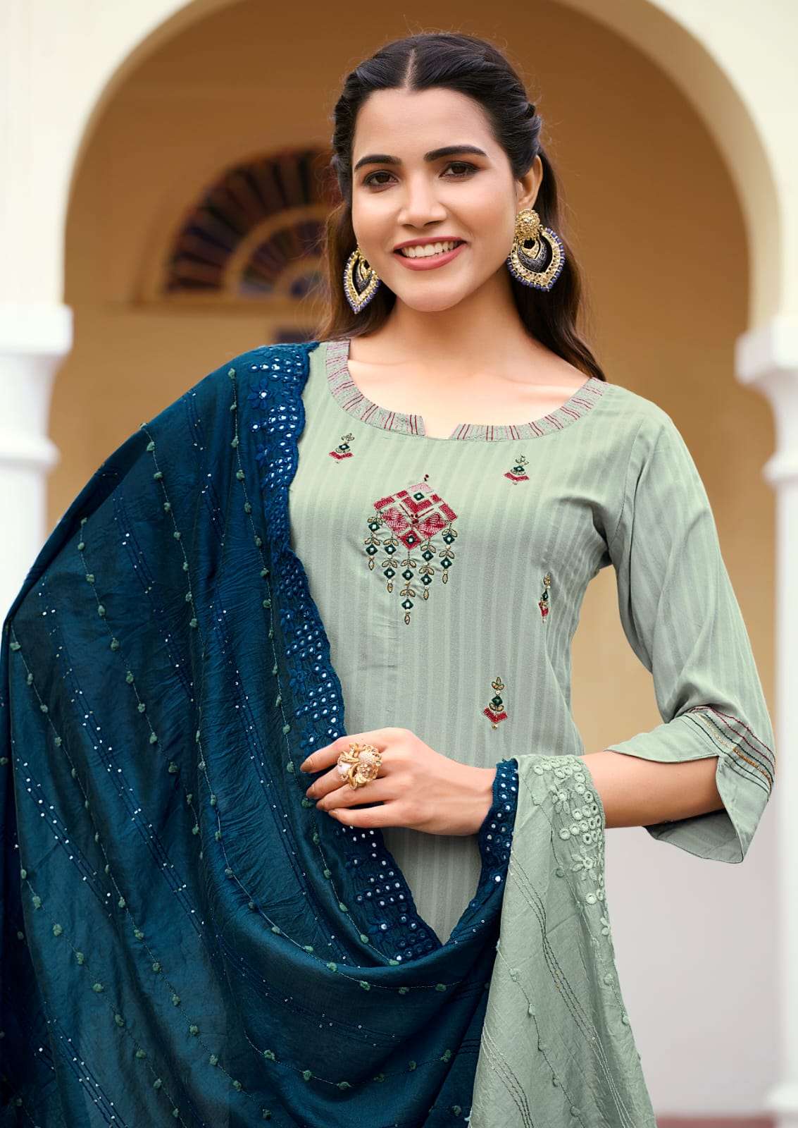 OPEL VOL 3 LIVA TAG VISCOSE RAYON WEAVING THREAD AND HANDWORK KURTI WITH PANT AND NYLON VISCOSE SEQUENCE DUPATTA BY KARISSA BRAND WHOLESALER AND DEALER