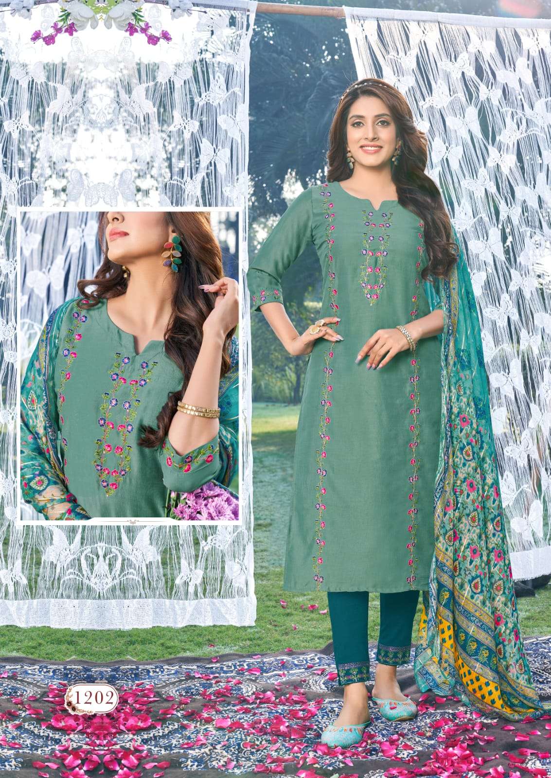 BRAND NAME : KARISSA CATALOG NAME : RAAS DESIGN : 6 TOP :TRENDY PREMIUM VISCOSE CHINON WITH PURE COTTON MALL INNER THREAD AND HAND WORK KURTI WORK : THREAD WORK WITH HAND WORK PANT : LIVA PREMIUM RAYON SLUB LYCRA WORK PANT DUPATTA : FANCY FABRIC DIGITAL PRINTED DUPATTA |