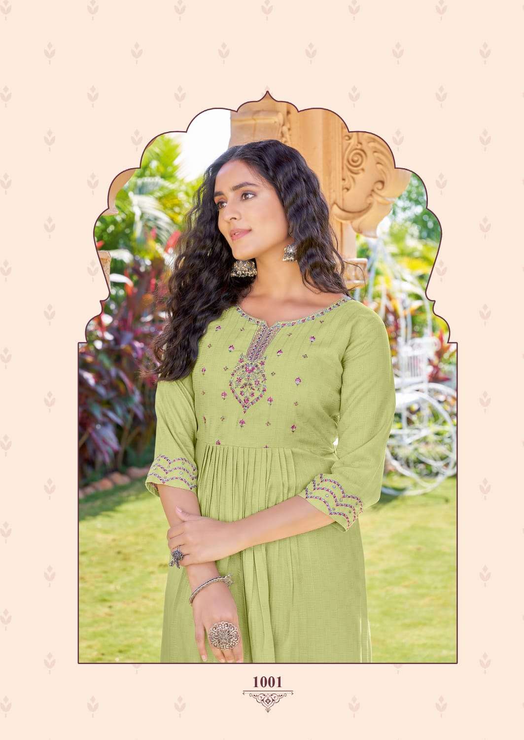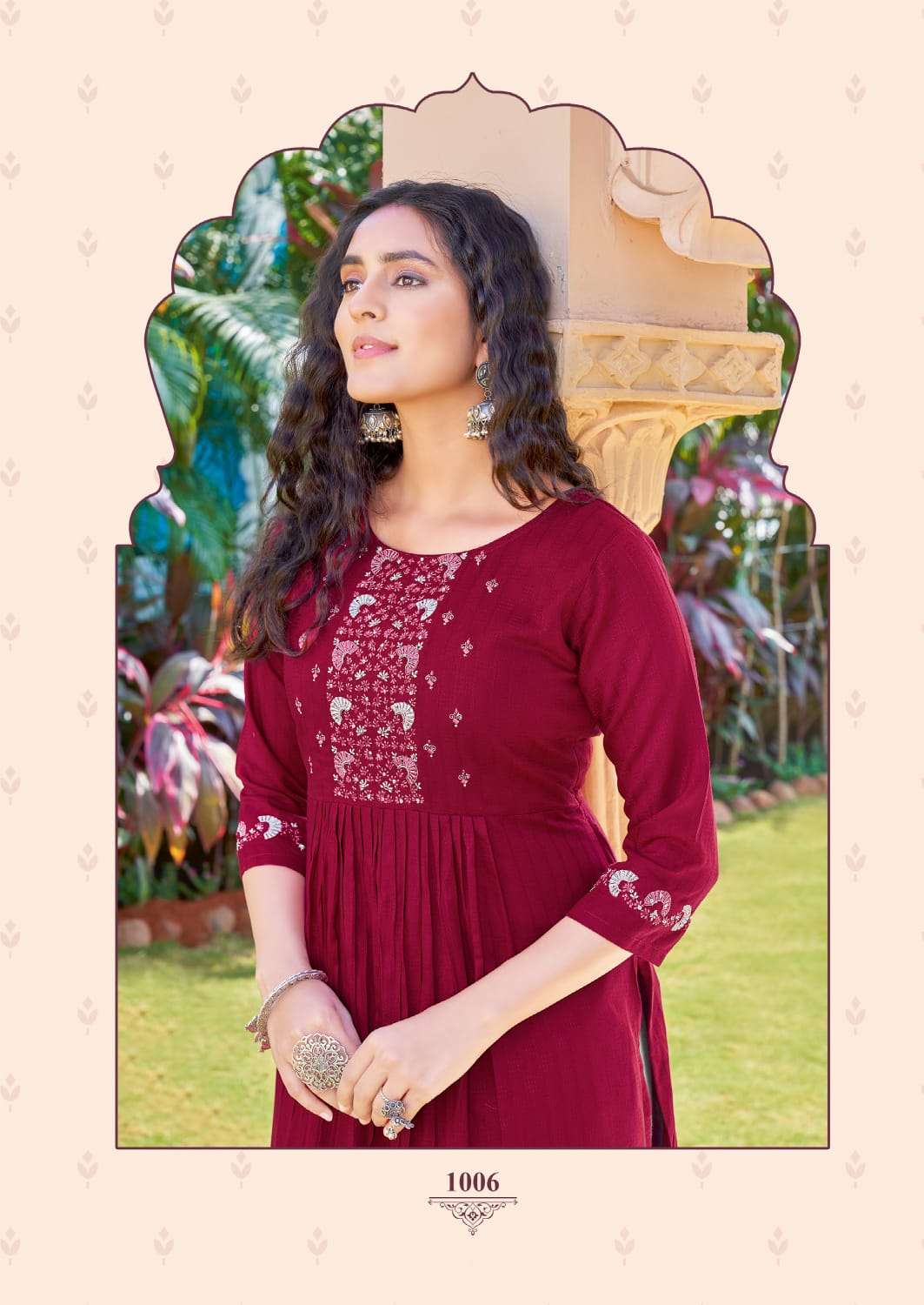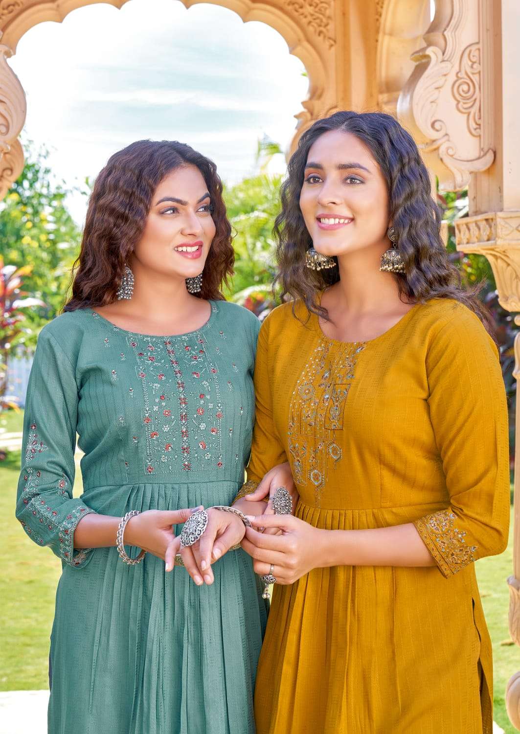 VATIKA BY KARISSA BRAND PRESENTS HEAVY FANCY REYON WEAVING EFFECT WITH LIVA TAG SEQUENCE THREAD WORK AND HANDWORK NYRA CUT KURTI - WHOLESALER AND DEALER