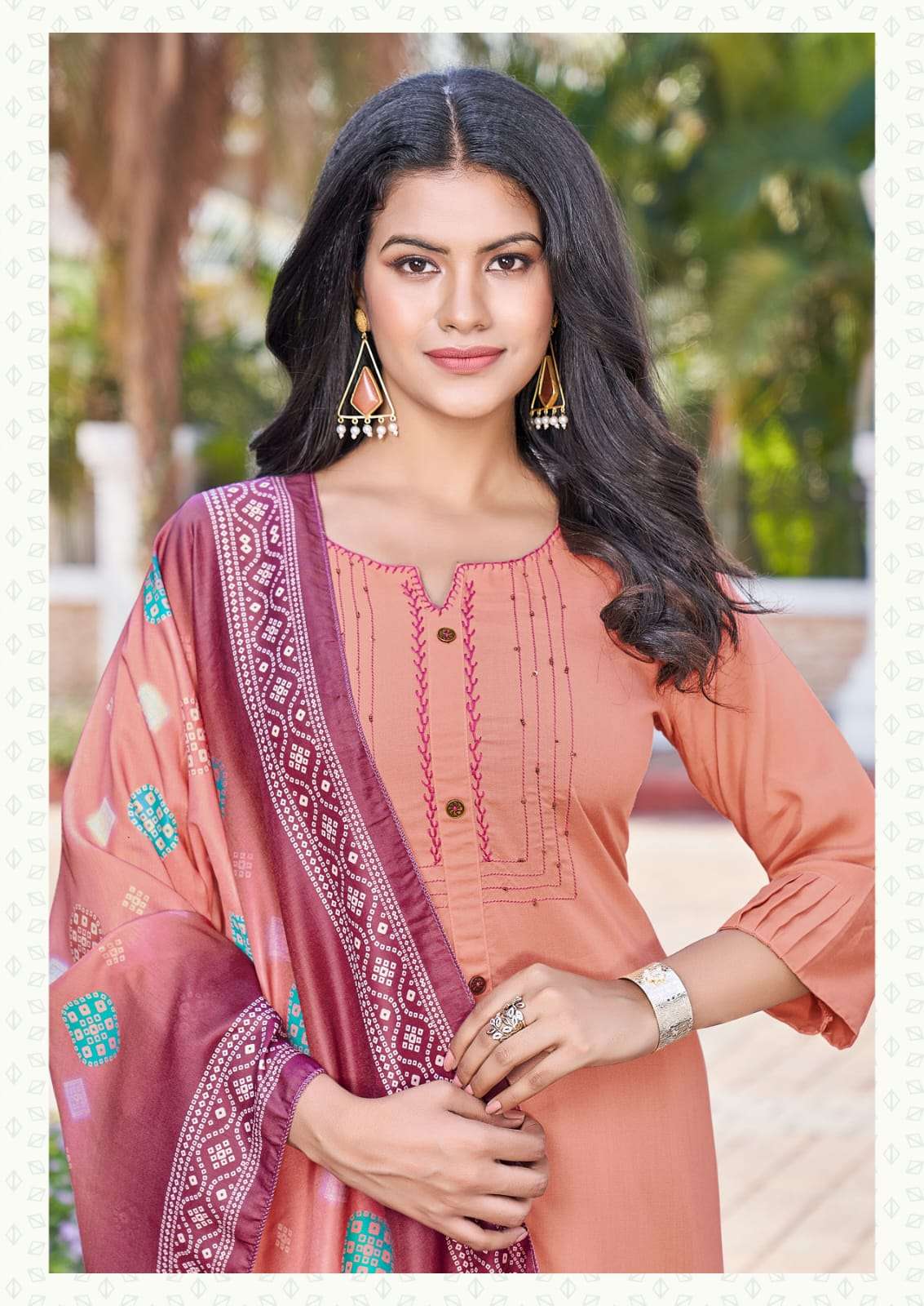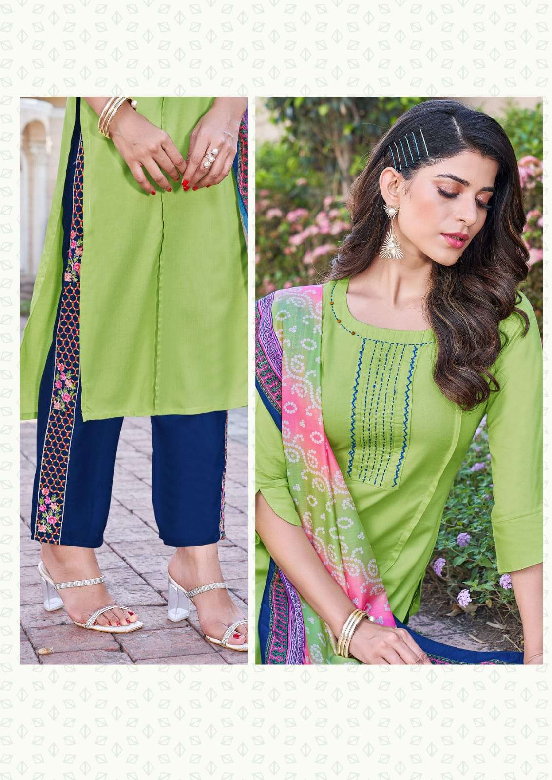 VIDISHA VOL 7 RAYON WITH LIVA TAG THREAD AND HANDWORK KURTI WITH PANT OR PLAZZO AND MUSLINE DIGITAL PRINT DUPATTA BY KARISSA BRAND WHOLSALER AND DEALER